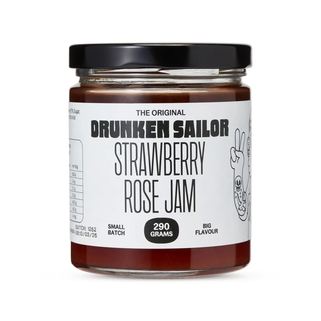 INGREDIENTS 60% Strawberry, 40% Sugar, Rose Water <1% Pectin, Citric Acid. Refrigerate after opening. Vegan. Gluten Free. Drunken Sailor Jams are made in Sydney’s Eastern suburbs, in small batches using high quality fruit and berries to ensure perfection is achieved.